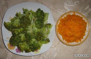Брокколи разрезать на части длиной 3-4 см. Морковь натереть на крупной терке.