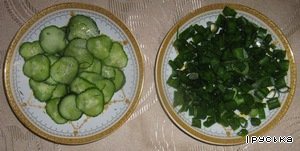 Нарезать лук и тонкими ломтиками огурец.