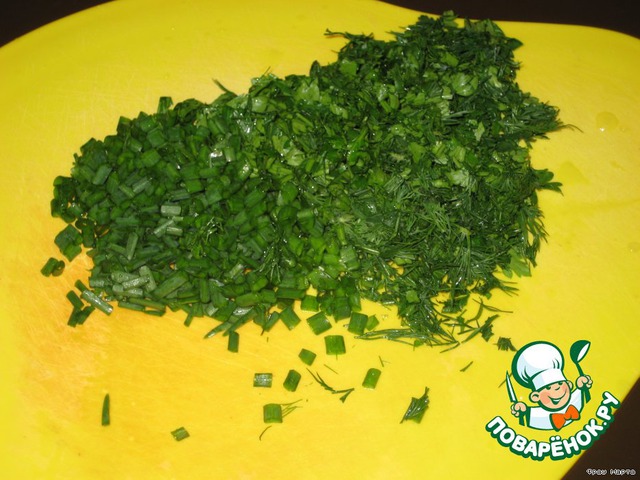 Петрушку, укроп, зеленый лук (еще можно кинзу и базилик) мелко режем.