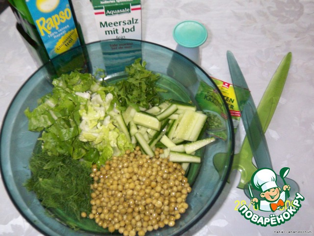 В салатницу выложите консервированный горошек, порезанные соломкой огурец, салатную капусту и зелень.
