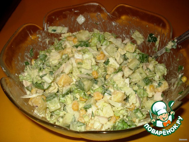 Всегда добавляла в салаты консервированные ананасы, но со свежим мне понравилось больше, да и полезнее, ведь известно, что кусочек ананаса во время или после еды сжигает часть съеденных калорий.