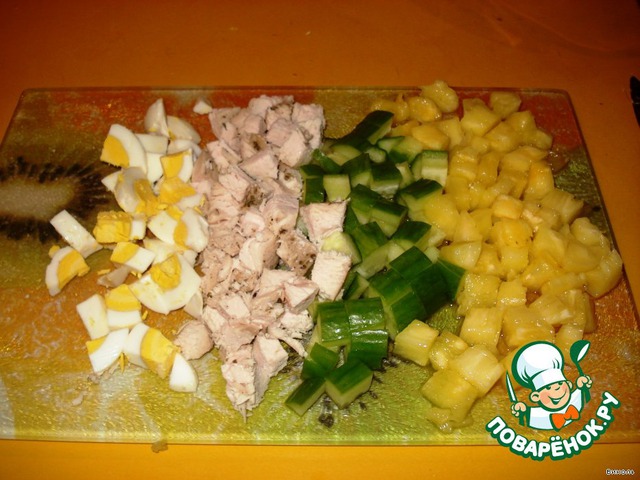 Ананас, огурец, яйцо и курицу нарезаем кубиками.