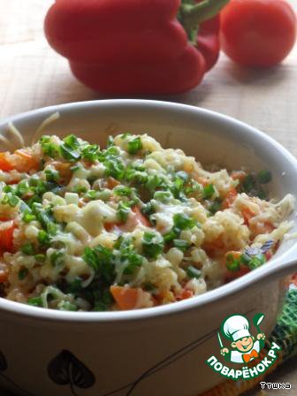 Сваренную киноа и булгур высыпать на сковороду к уже готовым овощам, добавить сок лимона, соль и перец по вкусу. Хорошо перемешать ингредиенты в течение минуты. Выложить готовый салат в блюдо, посыпать зеленым луком и тертым сыром.