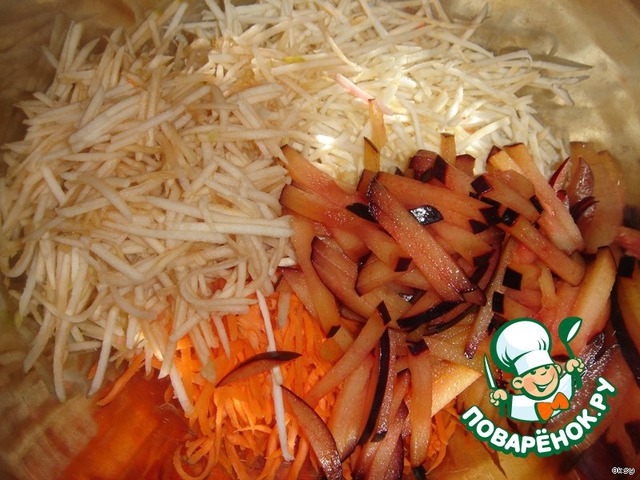 Добавить порезанные тонкой соломкой яблоки и сливы.