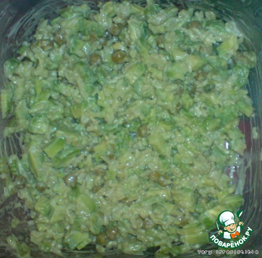 Салат готов. )) Очень приятный вкус, больше всего чувствуется авокадо, риса должно быть меньше. А сельдерей с горошком придают интересный оттенок.