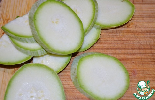 Кабачки моем и режем по диагонали на тонкие ломтики.