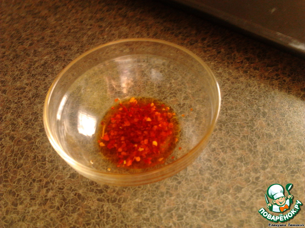 Наливаем кунжутное масло в небольшую чашечку и добавляем примерно пол чайной ложки красного перца. Отправляем в микроволновую печь примерно на 1-1,5 минуты. После чего масло должно остыть и настояться.