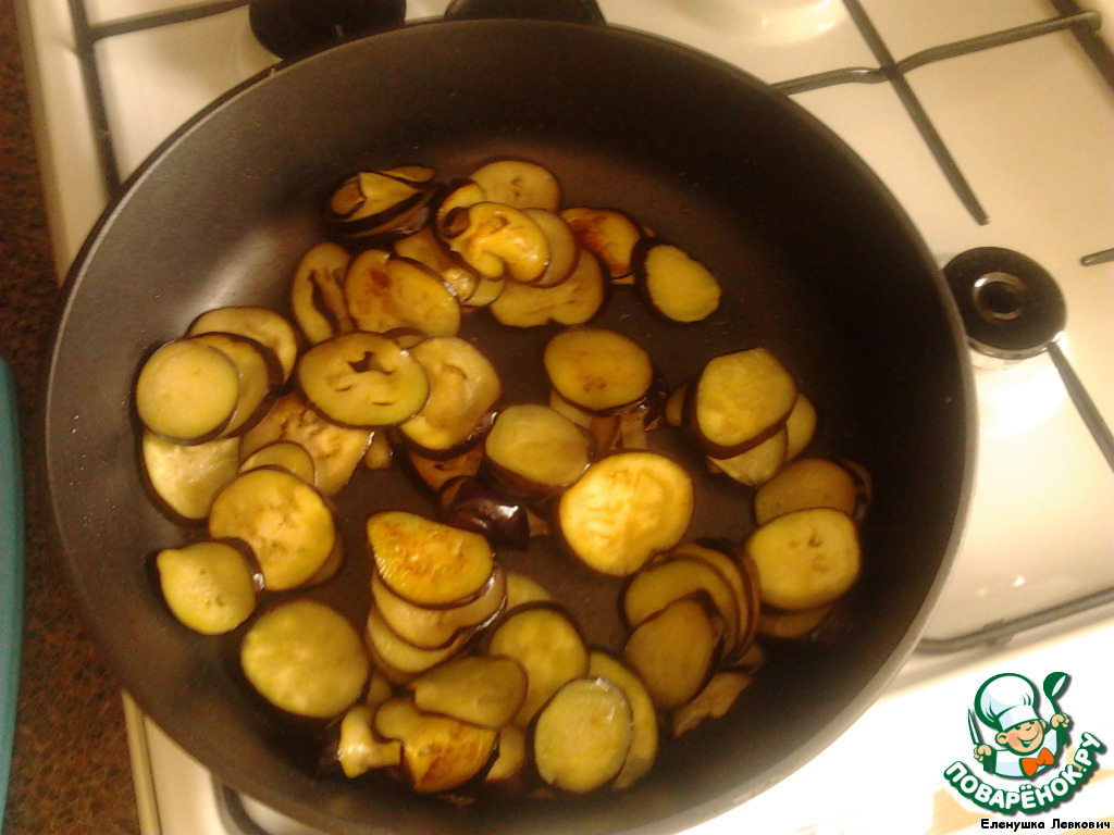 Нарезаем баклажаны кружками и обжариваем их до готовности. После чего вынимаем и выкладываем на бумажное полотенце, чтобы убрать все ненужное масло.