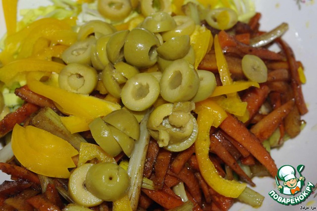 Оливки нарезаем кружочками. Добавляем в салат. Всё перемешиваем. Немного солим - по вкусу. НИЧЕМ не заправляем, так как в моркови и сельдерее есть и масло и уксус. Этого достаточно для заправки, у салата и так довольно насыщенный вкус.