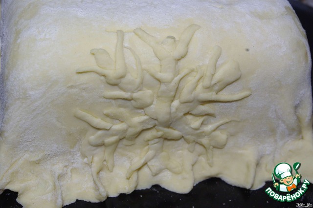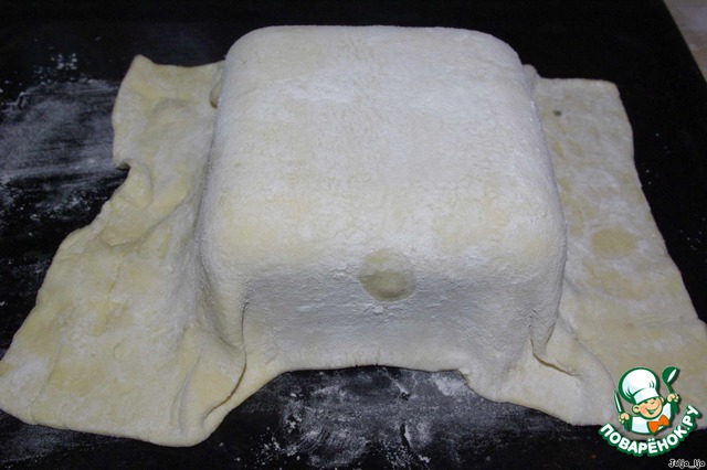 На противень ставим любую форму (жаропрочную), смазываем немного маслом, кладём сверху тесто. Лишнее отрезаем.