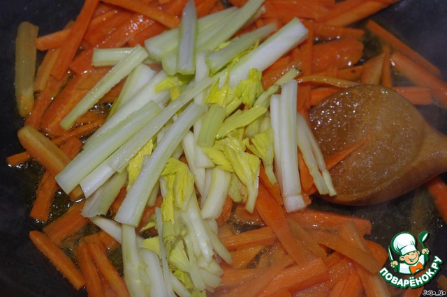 Добавляем остуженную морковь с сельдереем, нарезанный перец.