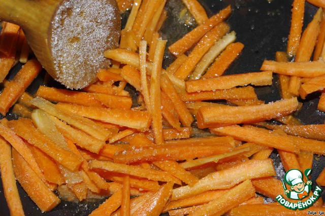 Для салата - морковь очищаем, нарезаем брусочками. Обжариваем на оливковом масле с добавлением небольшого количества сахара (по вкусу).