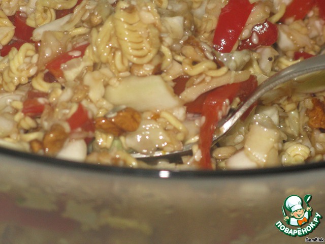 Шампиньоны нарезать полосочками, лапшу покрошить. В капусту добавить перец, шампиньоны, семечки и сезам, лук, орехи и лапшу.