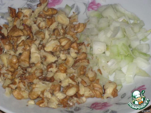 Лук и миндальные орехи мелко нарезать (в зимний период я беру обычный лук и вместо миндальных орехов добавляю грецкие :), но это уже мое предпочтение).