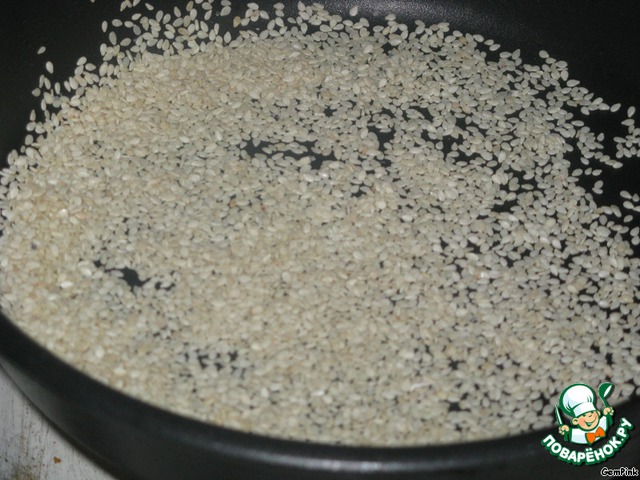 Сезам подсушить на сухой сковороде до слегка золотистого цвета.
