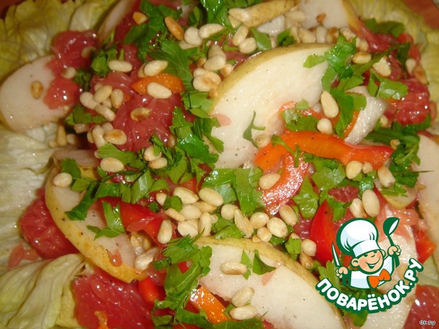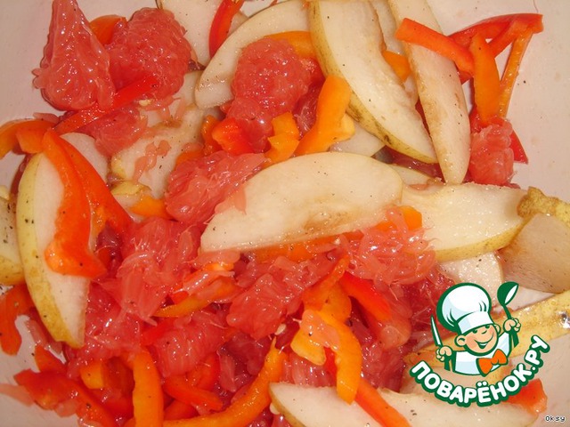 Перемешать груши, грейпфрут и перец. Полить заправкой из смеси винного уксуса, масла (у меня из виноградных косточек), соли и перца.