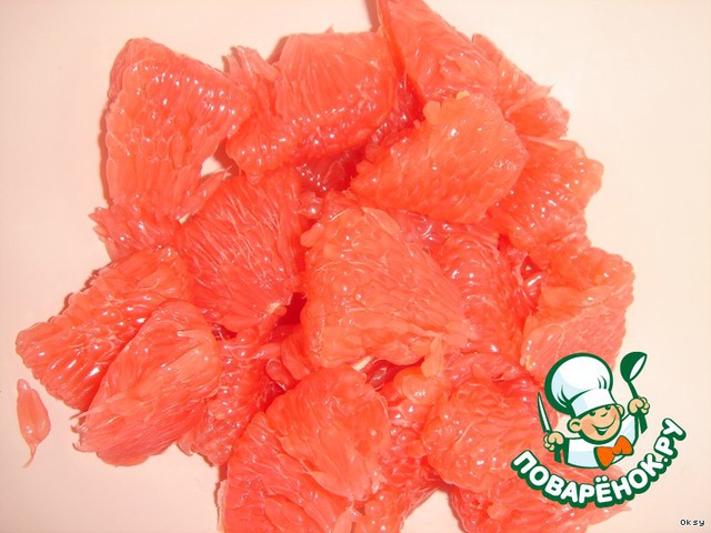 Самое трудное и долгое здесь - почистить грейпфрут. Очищенные от шкурки и пленок дольки грейпфрута разделить на кусочки.