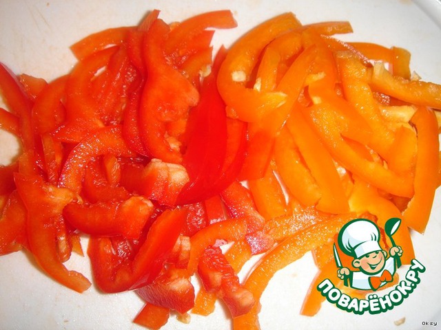 Перец (у меня были красный и оранжевый - по половинке) порезать соломкой.