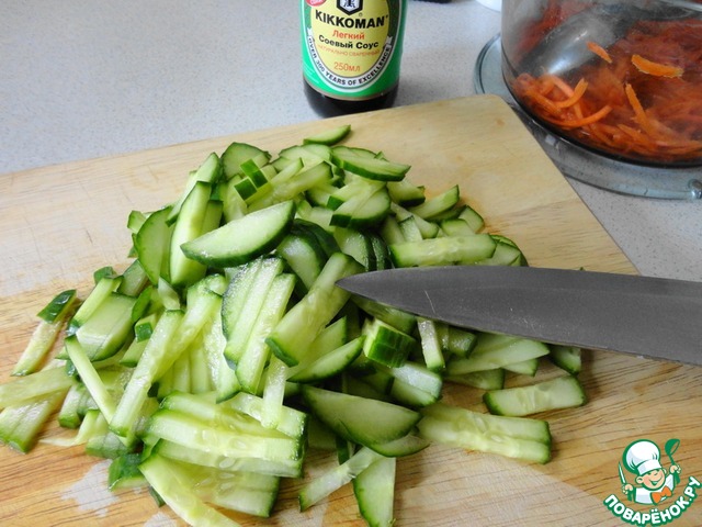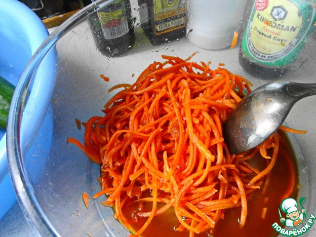Морковь шинкуем на корейской терке, добавляем соевый соус, уксус и оставляем мариноваться на 15 минут.