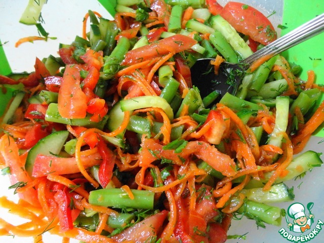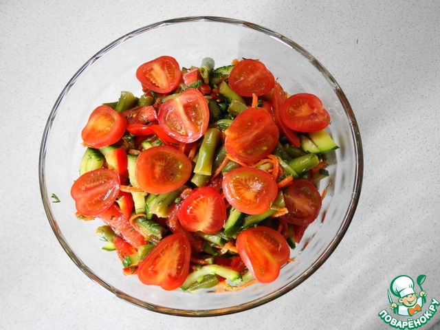Морковь отцеживаем от маринада (маринад не выливаем!). Все овощи выкладываем в большую миску, посыпаем рубленной зеленью.