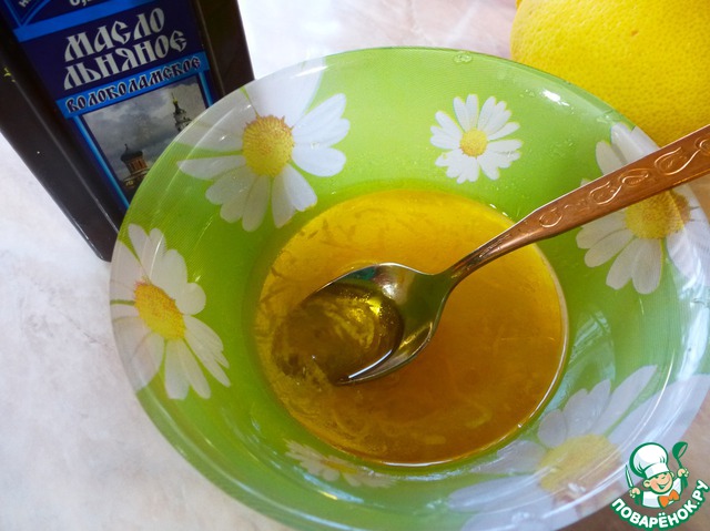Готовим заправку для салата: смешать лимонный сок, цедру, соль, перец, мед и льняное масло