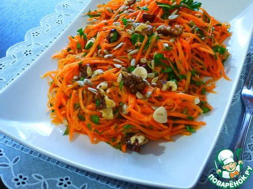 Смешать морковь, петрушку, орехи и заправку, дать настояться около 15 минут
