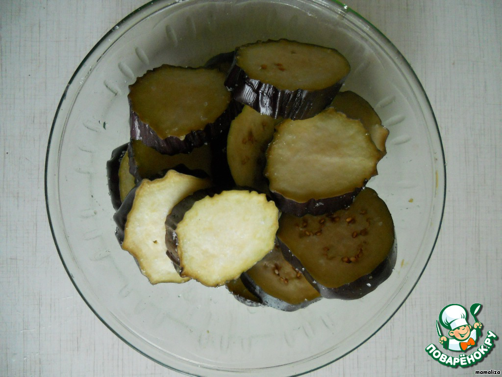 Баклажаны нарезать тонкими кружочками, посолить, дать постоять.