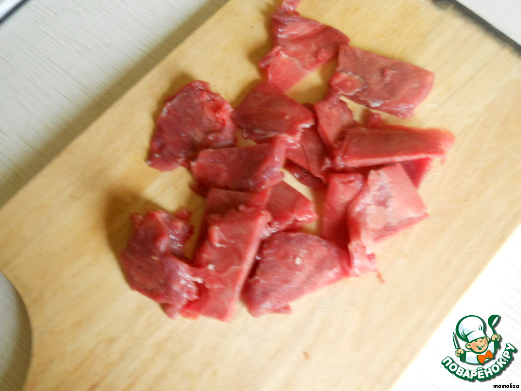 Подмороженную говядину нарезать очень тонкими ломтиками.