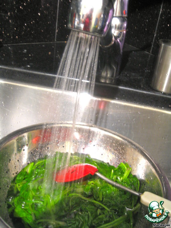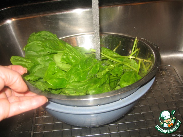 Шпинат очистить, поставить под проточную воду.