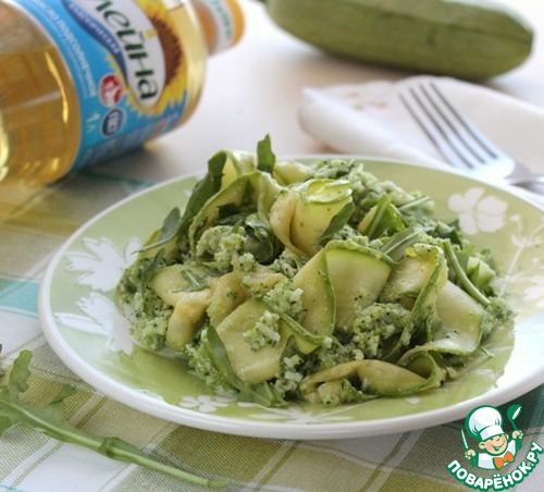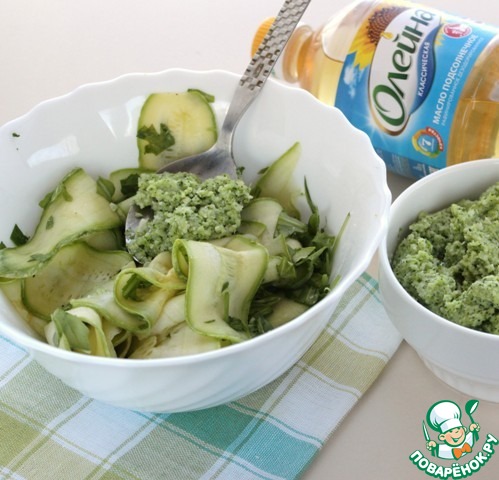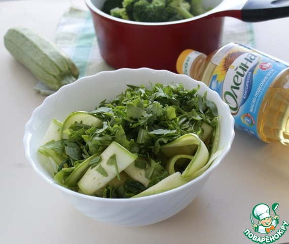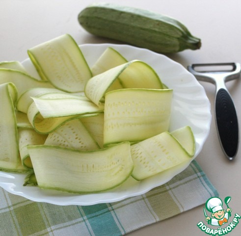 С помощью овощечистки или на терке Бернер нарезать тонкими лентами кабачок.