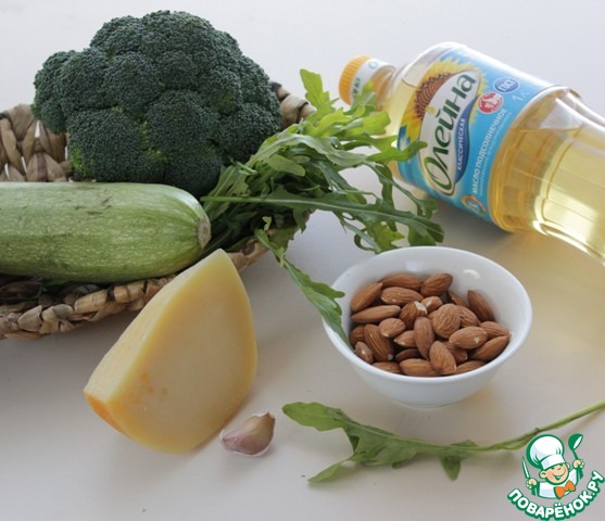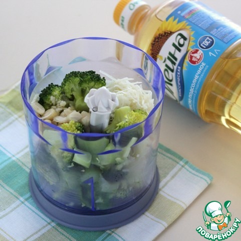 Сыр, чеснок, миндаль, брокколи сложить в чашу миксера и измельчить блендером, добавить подсолнечное масло Олейна, ещё раз пробить блендером.