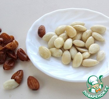 Миндаль залить кипятком на 2 минуты и очистить от кожицы.
