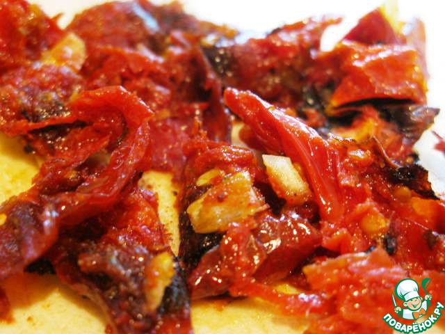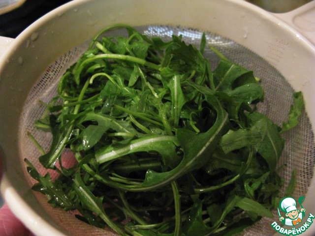 В рукколу добавить томаты, поломать полоски сыра, всё перемешать. Посолить, добавить сушёный базилик и заправить оливковым маслом.