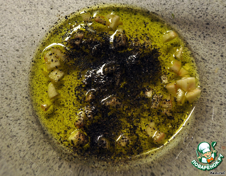 Для приправы в оливковое масло добавим чеснок (нарезанный), соль, перец, можно (и очень хорошо) сок лимона