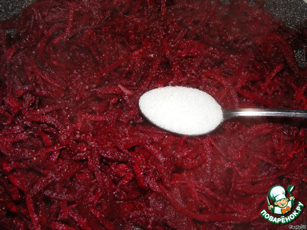 В свеклу добавляем чайную ложку сахара и столовую кетчупа, соль, перец по вкусу и тушим еще минут 5.