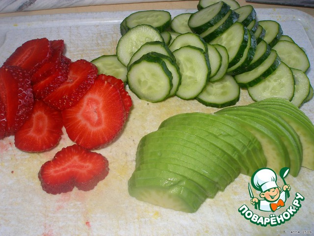 Клубнику, авокадо и огурец нарезать тонкими дольками.