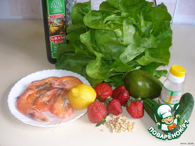 В середину кочана выложить нарезанные огурцы, клубнику, ломтики авокадо. Посыпать кедровыми орешками.