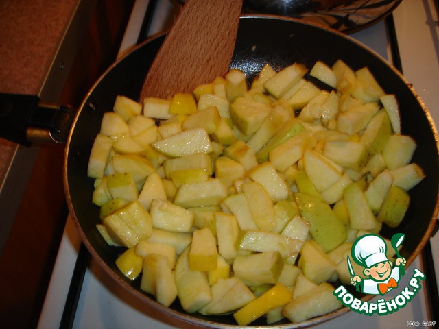 Яблоки порезать кубиками (не мелко) и обжарить на оливковом масле.