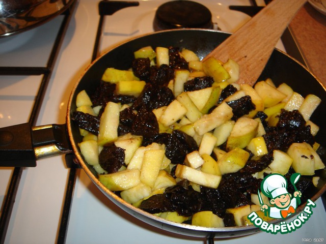 Чернослив промыть и тоже порезать, добавить к яблокам , слегка потушить все вместе. Охладить до комнатной температуры.