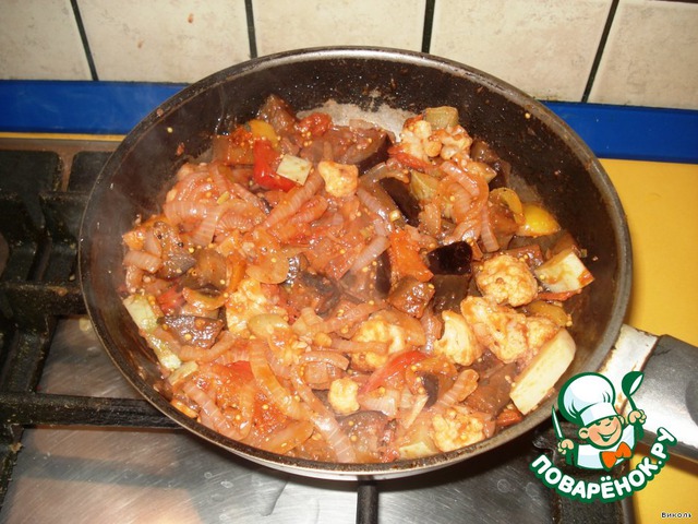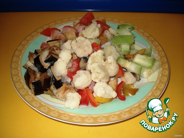 Овощи я замораживала сама, но можно, конечно же, купить. Я взяла по горсточке баклажан, кабачка, перец сладкий, помидор, цветная капуста.