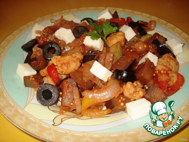 Теплый салат выложить на тарелку, посыпать порезанной кубиками брынзой и маслинами. Все! Можно наслаждаться и вспоминать летние теплые деньки.