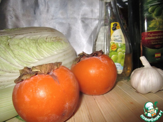 Мелко нашинковать капусту и посолить. Порей нарезать тонкими полукольцами. Срезать с хурмы кожуру. Нарезать ломтиками. Смешайте салат с оливковым маслом и уксусом. Салатник натереть чесноком. Выложить салат.