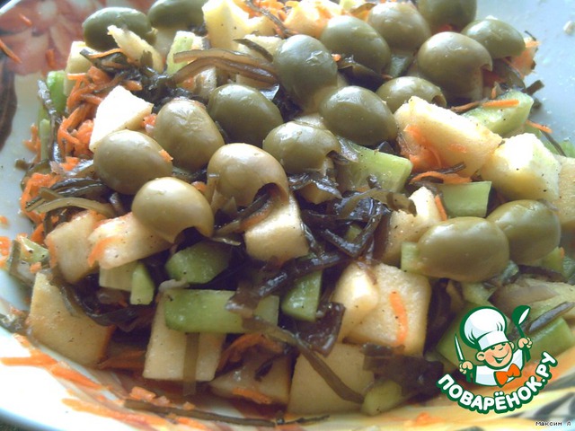 Добавляем морскую капусту. Солим по вкусу. Перемешиваем.