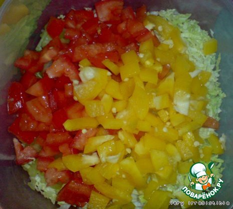 Добавляем нарезанные некрупными кубиками помидоры и перец.