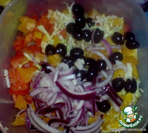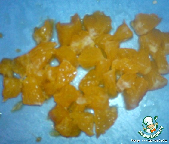 Апельсин очищаем от пленок и режем небольшими кусочками. Добавляем в салат.