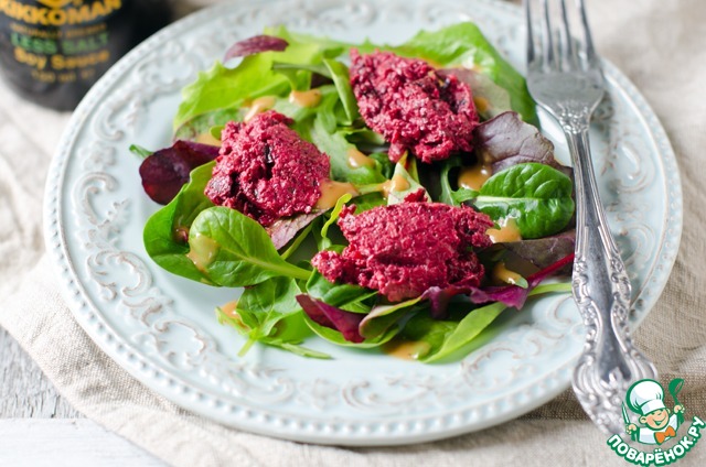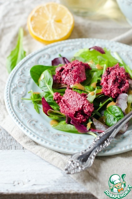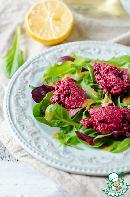 С помощью двух ложек сформировать из свекольного мусса клецки и уложить их на салат.