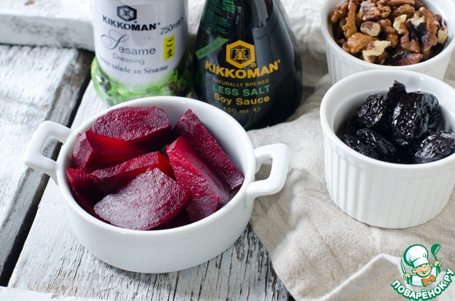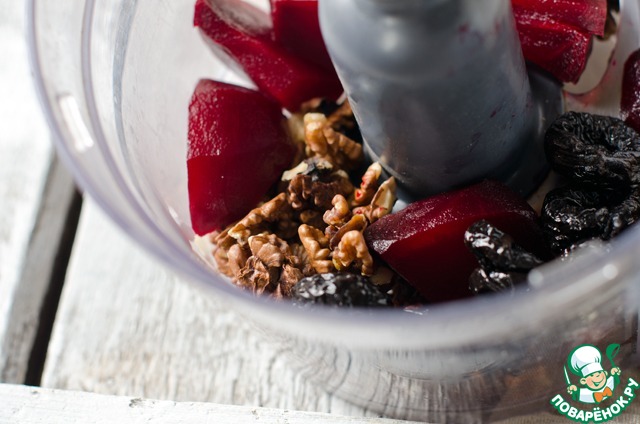 В чашу процессора поместить свеклу, чернослив и грецкие орехи.