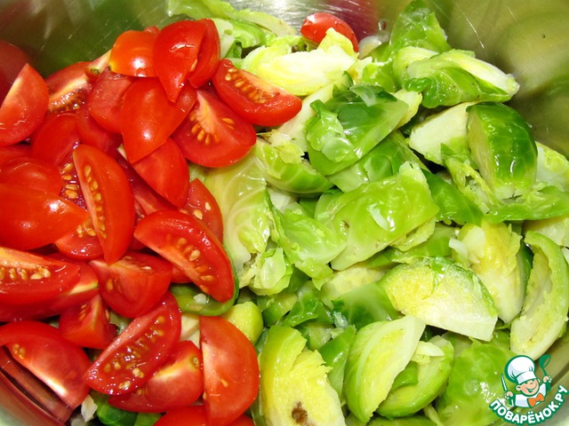 Капуста немного обсохнет, перекладываем ее в миску, добавляем нарезанные четвертинками помидорки, подсаливаем по вкусу.