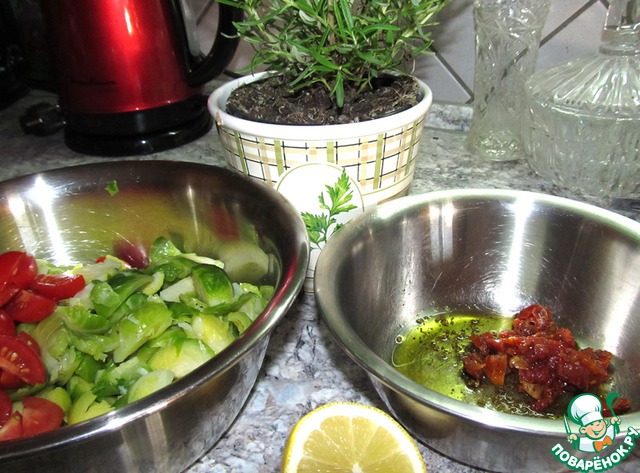 Для заправки смешиваем оливковое масло, прованские травы, соль по вкусу, мелко нарезанный розмарин и вяленые томаты, сок половины лимона.
