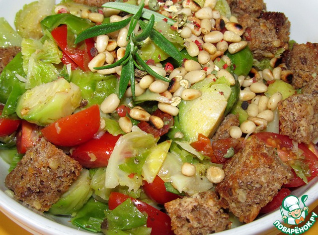 | Полезный и вкусный салат, который может вполне заменить ужин! С брюссельской капустой я знакома всего несколько последних лет (раньше не довелось попробовать), узнала о ее пользе, теперь стараюсь готовить пощаче, тем более, что она вкусна и в салатах, и в горячих блюдах. Брюссельская капуста низкокалорийна, содержит клетчатку, железо, фосфор, калий, витамины группы В, провитамин А. Ее употребление снижает риск раковых заболеваний и заболеваний сердечно-сосудистой системы. Очень богата содержанием витамина C. Не содержит натрия и холестерина. Будущим мамам рекомендуется как источник фолиевой кислоты, которая необходима для правильного развития нервной системы и уменьшает риск врожденных пороков у детей. Сплошная польза! НО брюссельскую капусту не стоит употреблять людям, страдающим заболеваниями кишечника и имеющим повышенную кислотность желудка. |